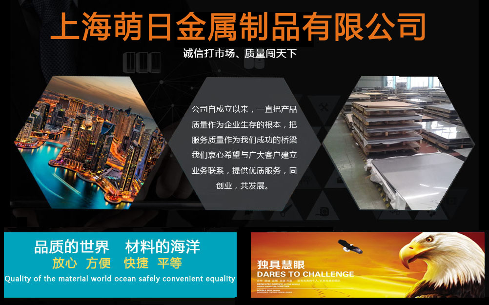 上海萌日金屬制品有限公司一直致力于為國內(nèi)各大中型國有企業(yè),外資企業(yè),民營獨資企業(yè),模具制造企業(yè),機械加工企業(yè),石油化工企業(yè)及器械企業(yè)等供應各種特種鋼材,進口/國產(chǎn)鋁合金,不銹鋼,合金結(jié)構(gòu)鋼,42CrMo鋼板,35CrMo鋼板,40Cr鋼板,合金圓鋼,中厚板,鍛件,法蘭,鋼帶,軸承鋼,易切鋼,不銹圓鋼,合金管,矩形鋁管,無縫鋁管,鋁管,工業(yè)鋁管進口及國產(chǎn)方胚/鋼錠/鋁錠,應用于機械,機電,造船,工程,煤礦,紡織,電力,鍋爐, 汽車工業(yè)等各個領域。我公司可以根據(jù)客戶對特殊材料的要求進行材料和產(chǎn)品的定制,可按ISO,ANSI,JIS,DIN,GB等標準定制,我們將本著"誠實守信,合作共贏,長期合作"的理念與新老客戶一起進步發(fā)展。